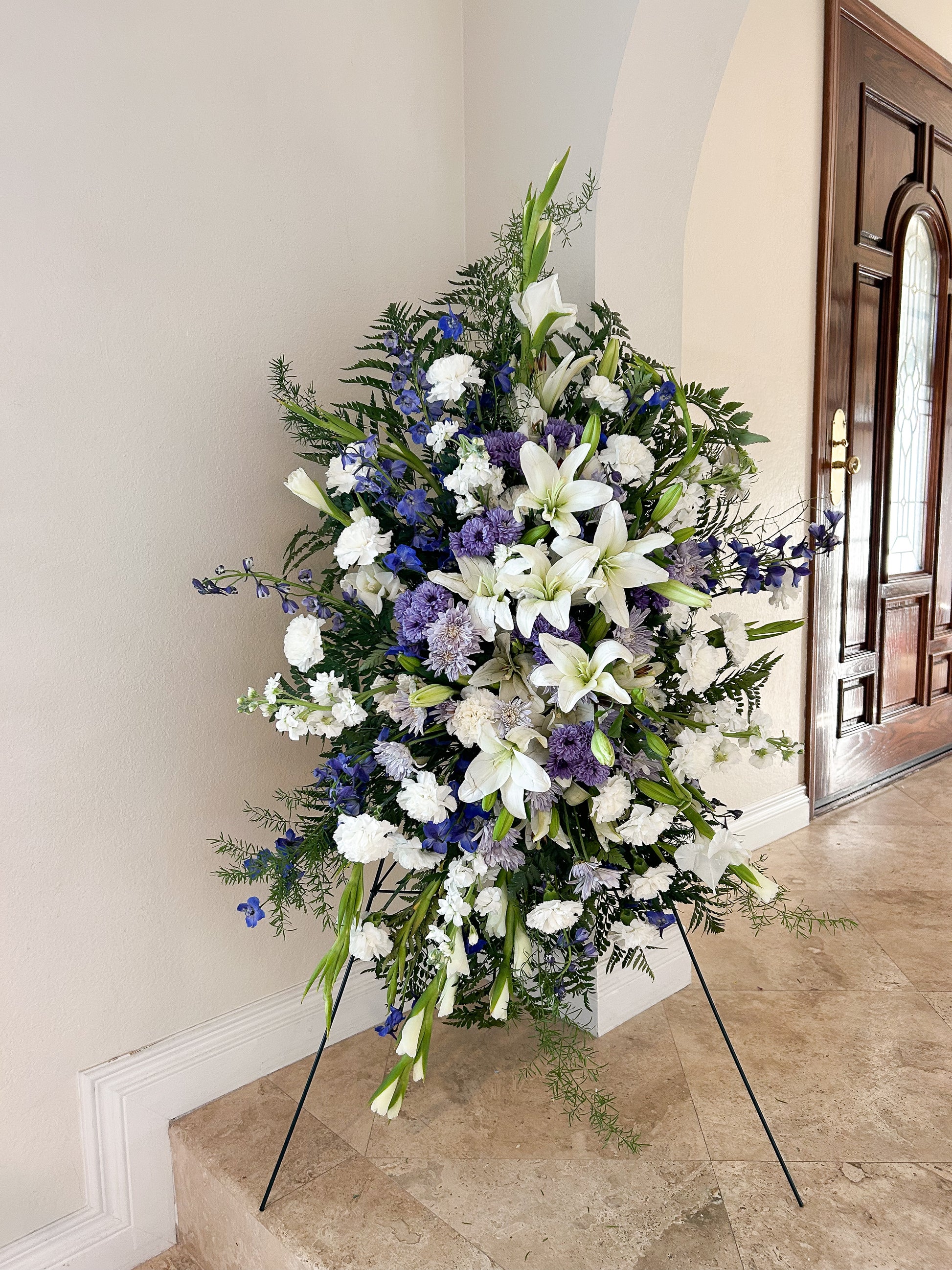 A funeral spray consisting of multiple types of seasonal flowers. Please request color scheme. (Available to deliver to San Diego County only.) Can deliver to other locations for extra charge.