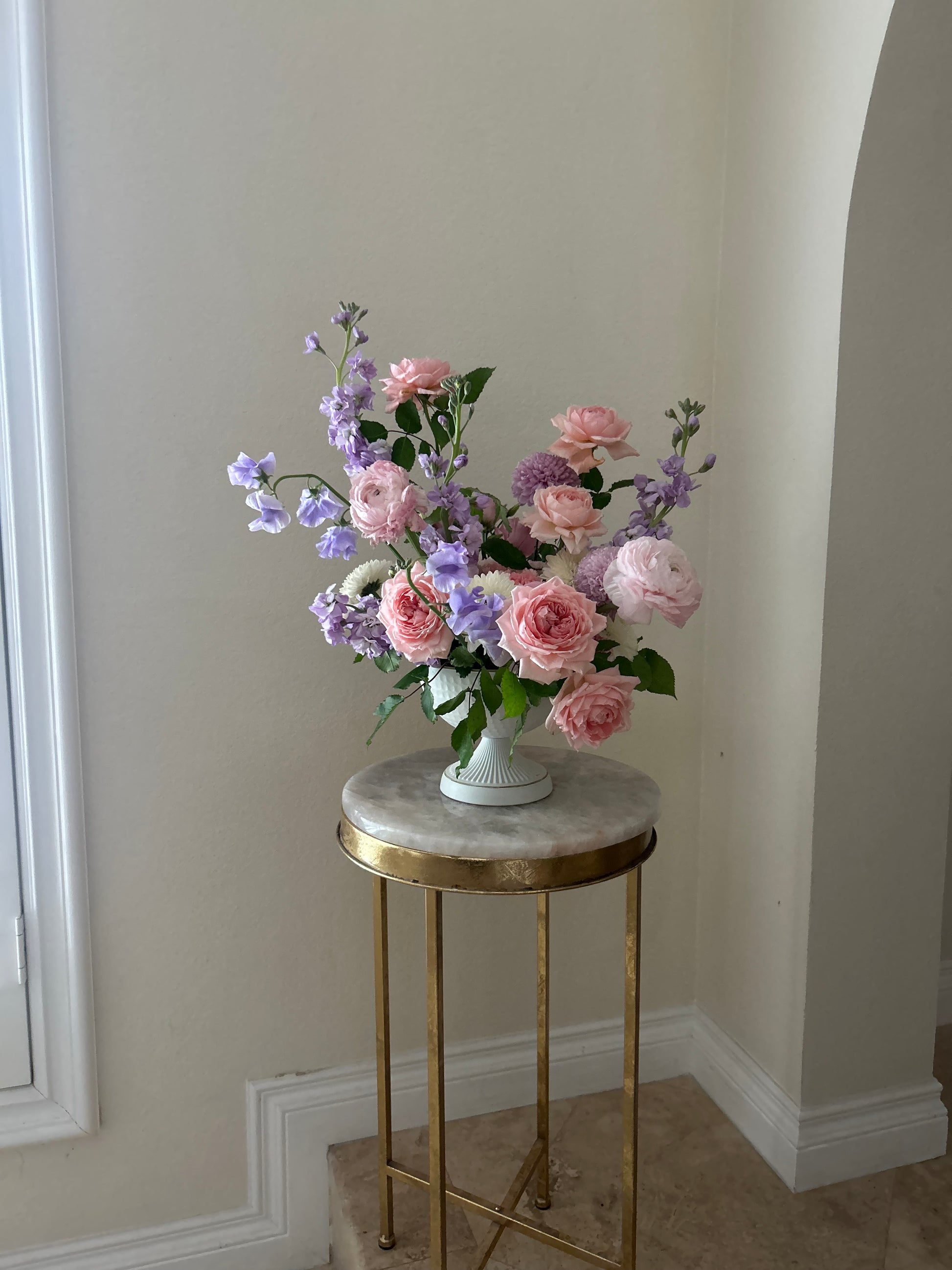 A large flower arrangement with a variety of pastel colored flowers. Flower types are dependent on what is in season. (Includes floral foam & vase.) (Can deliver to San Diego County only.) Can deliver to other locations for extra charge.