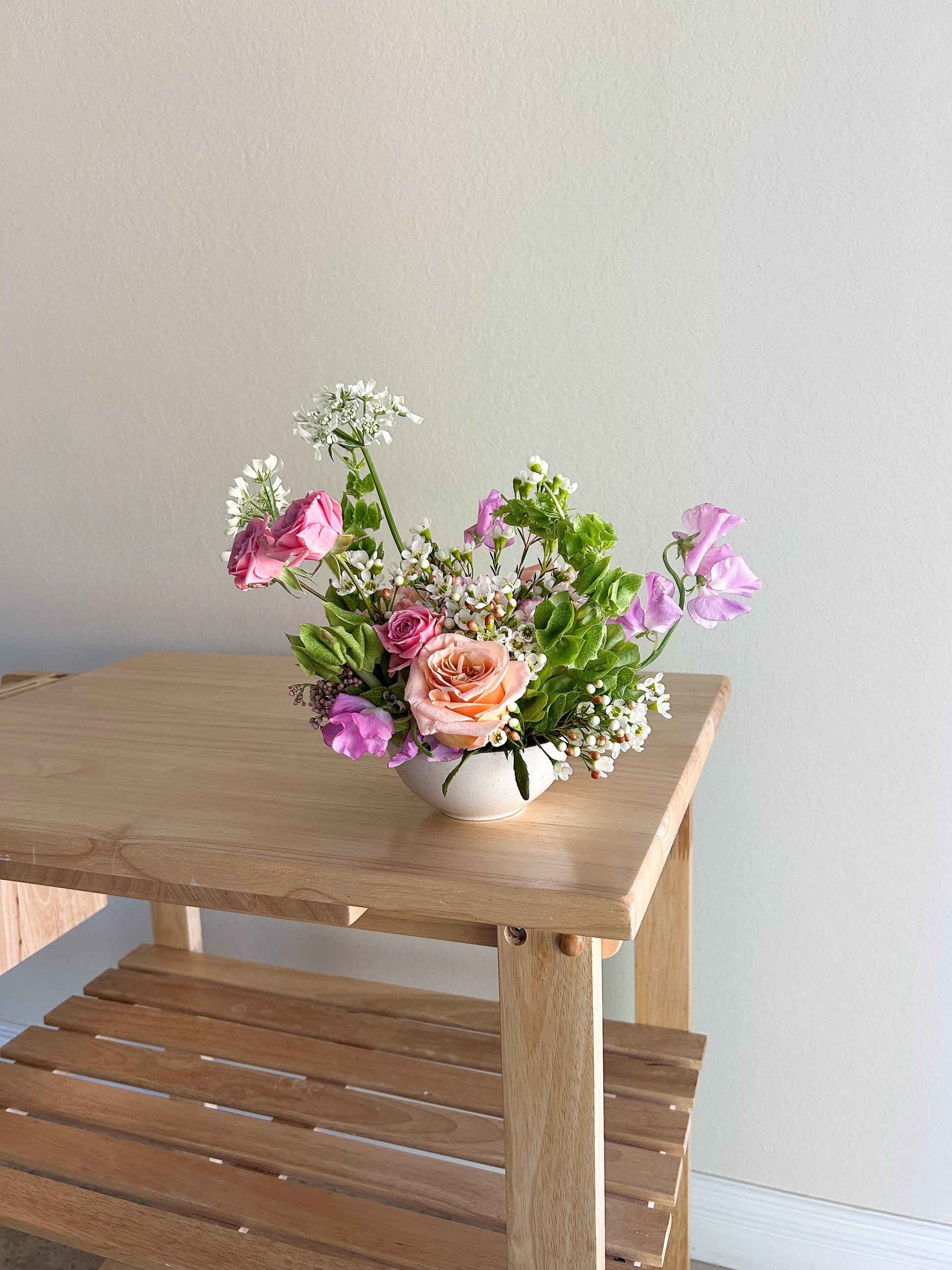A small arrangement with flowers and colors that are in season. (Includes floral foam & vase.) (Can deliver to San Diego County only.) Can deliver to other locations for extra charge.